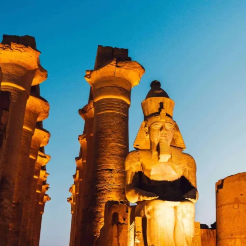 Wenn die Sonne untergeht, zeigt sich Luxor von seiner romantischsten Seite. Die Tempel werden beleuchtet, der Luxor-Tempel erstrahlt in warmem Licht, und entlang der Nilpromenade entsteht eine lebendige, aber entspannte Abendstimmung. Ein Spaziergang durch den Basar oder entlang des Nils bietet authentische Einblicke in das lokale Leben.